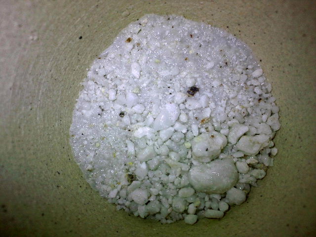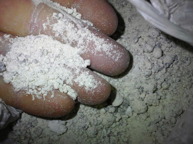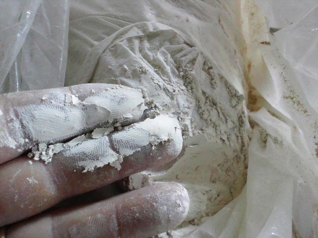 スタンプミル(破砕部石材)粉砕後 極力長石だけを潰すように粉砕しています。